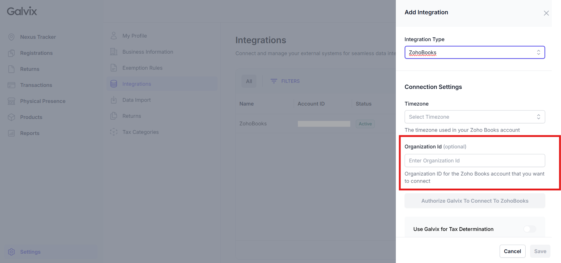 - If you have multiple Zoho Books organization, enter the organization ID of the one that you'd like to connect with Galvix.