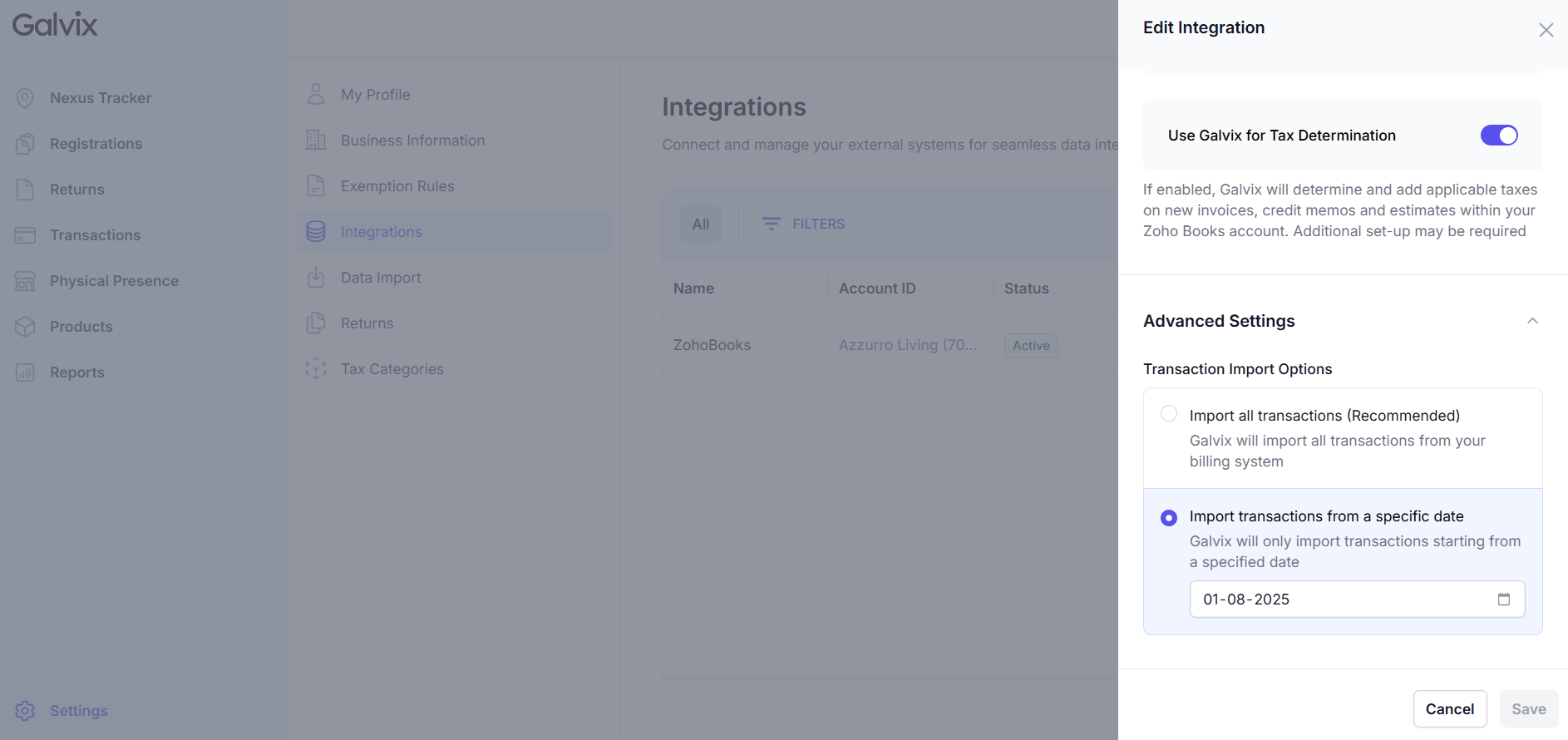 This delegates the tax calculations to Galvix for all invoices and credit notes that will be created in Zoho Books.